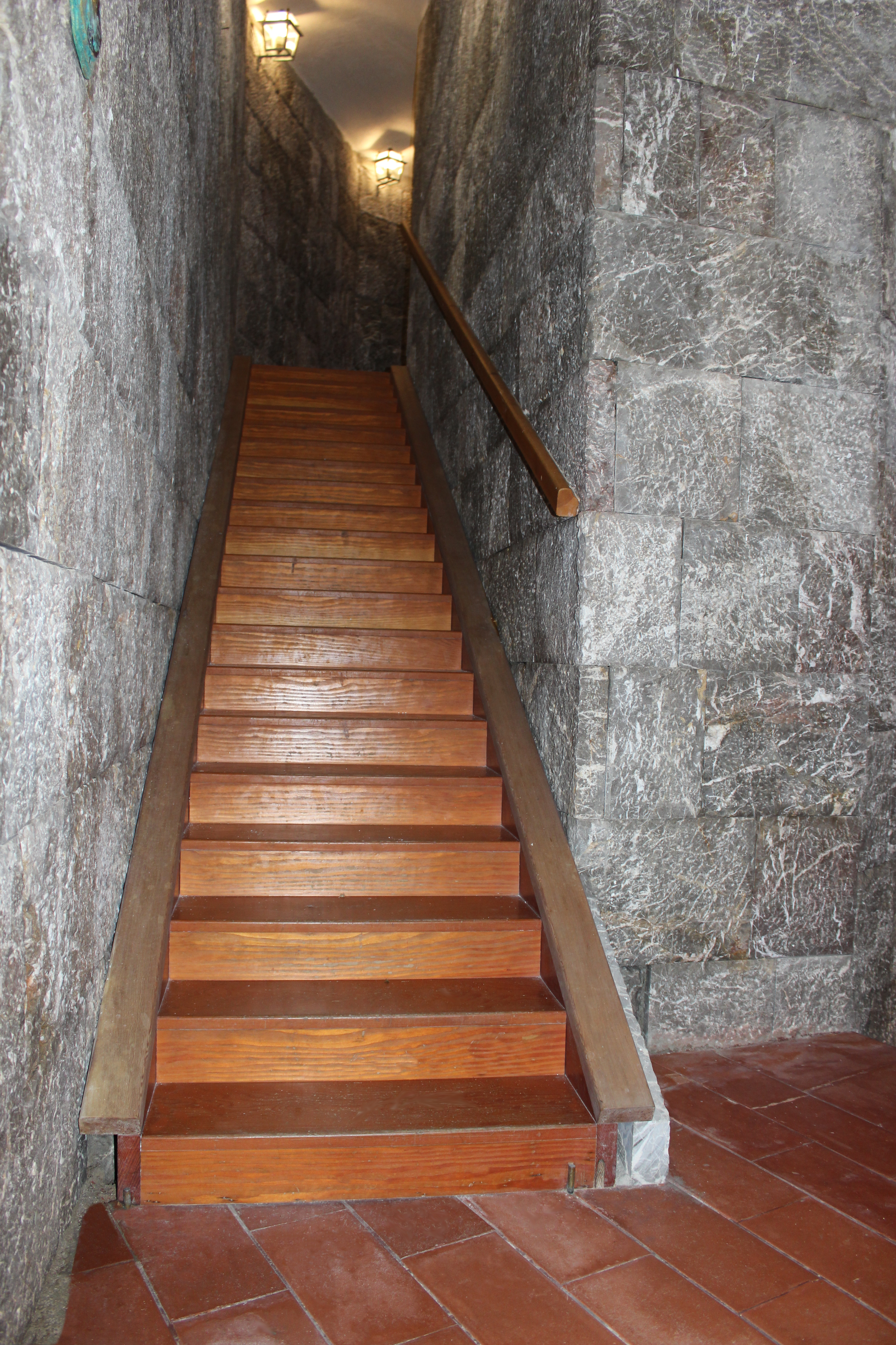 La escalera tiene escalones de reducida altura, que los fieles, cuando es posible, suben de rodillas hasta llegar a la cueva superior, decorada por el artista Francesco Lonardo, donde se encuentra una pequeña estatua de la Virgen Negra. Las salidas de fuego de la casamata superior han sido abiertas de nuevo, dos de ellas se han transformado en pequeñas ventanas mientras que la tercera, orientada al norte, se ha convertido en la puerta de salida, junto al panel informativo. A partir de este punto la ruta se bifurca. Bajando se llega a la avenida del Misteri o, continuando la subida, se llega a la plaza panorámica sobre la que se encuentra la base que sostiene la estatua de la Madonna de Tindari, realizada junto con los bajorrelieves que representan los Misterios, en 1986, del escultor Roman Andrea Trisciuzzi (foto 12).