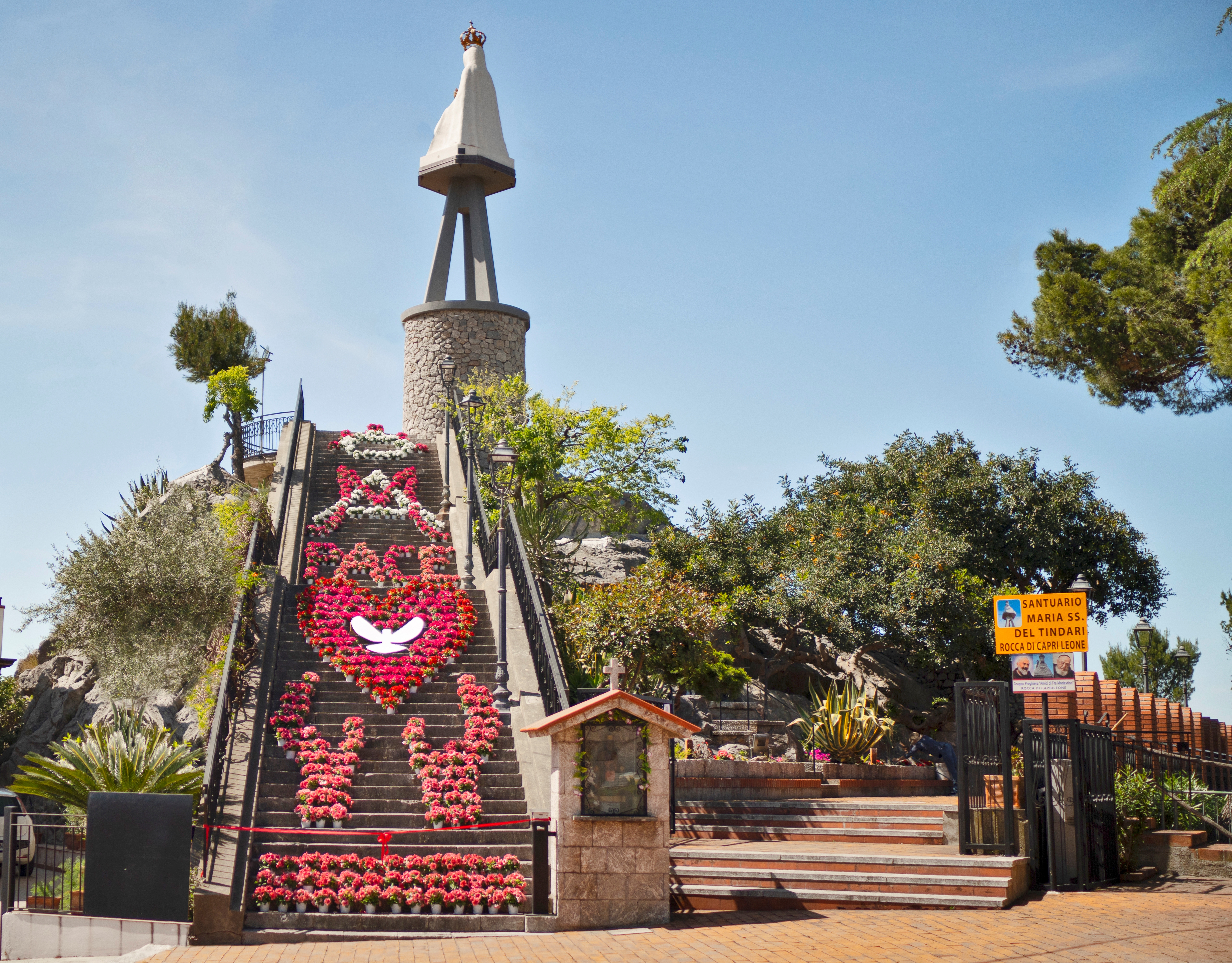 En 2017, durante la ejecución de trabajos de mantenimiento en el pedestal y la base que sostiene la estatua, se reemplazaron las coronas de la Virgen y el Niño Jesús, así como el lirio sostenido por la Virgen. Estos ornamentos fueron creados por el escultor Mario Roberto Valenti de Rocca di Capri Leone y bendecidos por el Obispo de Patti, Guglielmo Giombanco. OCada año, en mayo, la escalera principal es escenario de una característica exhibición floral, organizada por la asociación local "Movimiento Juvenil", un evento que con el paso de los años se ha convertido en un momento de recogimiento para toda la comunidad en torno a la Estatua de la Virgen. (foto 16).